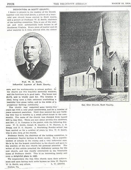 Our local assembly dates back to 1889. It was then that a group of believers started the Cleveland Sunday School in the in the Yuma community of Gate City, VA. Over the years it grew into a church called Laurel Hill Baptist Church. Then in 1913 a new building was erected and the church was renamed Oak Glen Baptist Church.